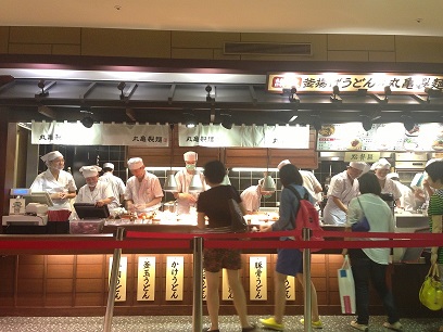 最後分享一下我今天午餐的心得 -「丸龜製麵」的烏龍麵。我在新光三越地下街看到一排廚師在裝潢得很日式的攤位裡面有幹勁的工作著,就被吸引了!