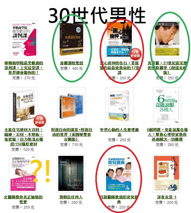 30世代的男性榜單簡直是80後年輕人的奮鬥史,首先要努力存錢(財務自由的講堂)好跟黑心仲介斡旋買房 (黑心房仲的告白),下班後也有作業要交還不能太隨便 (女醫師學習真正愉悅的性愛),不小心搞出人命來就得無止盡的黑眼圈生活了(百歲醫師教我的育兒寶典)。那麼多人生課題要完成,大大小小的人要搞定,難怪而立之年最想學的是談判技巧(華頓商學院最受歡迎的談判課) 夜深人靜的時候會想看 深夜食堂 & 別相信任何人。